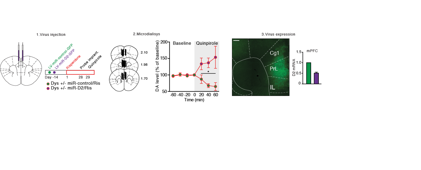Genetic variations reducing dysbindin-1 confer unique potentiation of cortical D2 autoreceptor activity following antipsychotics. In a recent study we injected Dys+/− mice with a synthetic microRNA (miR) to inactivate D2 receptors (LV-miR-D2, green circles) or a control miR (LV-miR-control, purple circles) in the mPFC. After 2 weeks, animals received daily injections of Veh or Ris for 28 days and then have been implanted with a microdialysis probe for extracellular dopamine level measurement. On the following day in vivo microdialysis quinpirole-induced dopamine release was measured. To challenge dopamine release, a D2 receptor agonist has been infused intracerebrally in the mPFC of these mice. In particular, in Dys+/− treated with Ris, D2 silencing increased dopamine release. Injection of a control miR in Dys+/− Ris-treated mice further confirmed a decrease of quinpirole-mediated dopamine release. Error bars represent S.E.M. *p < 0.05, **p < 0.005. From Scheggia et al Nature Communications 2018.