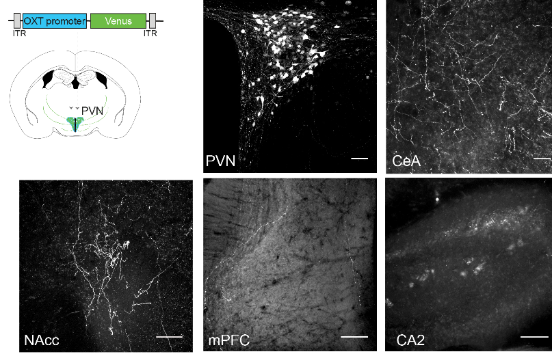 PVN OXT Release Is Necessary for Emotion Discrimination: Mapping of PVN OXT Projections in Mice. Scheme of the viral vector used to infect the PVN OXT neurons. Anatomy of OXT projections from the PVN to the central amygdala (CeA), nucleus accumbens (NAcc), medial prefrontal cortex (mPFC), and hippocampus CA2 (CA2). Scale bars: 100 mm. Error bars represent standard error of the mean. From Ferretti et al Current Biology 2019.